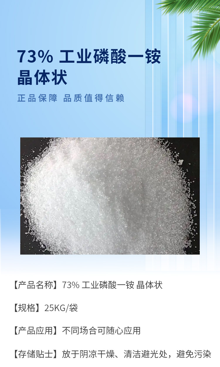 商品名称:73% 工业磷酸一铵 晶体状 25KG装 商品货号 : FDD003315 品牌 : 其它 产地 : 湖北省 产品型号 : - 包装规格 : 25KG装 等级 : - 生产许可证号 : - 含量 : 73% 粒度 : - 用途 : 见详情
