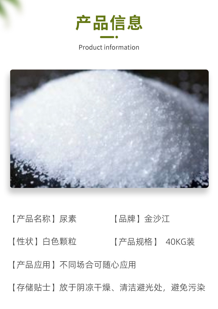 商品名称:金沙江 尿素 40KG装 商品货号 : FDD003946 品牌 : 其它 产地 : -- 产品型号 : - 包装规格 : 40KG装 等级 : - 生产许可证号 : - 含量 : -