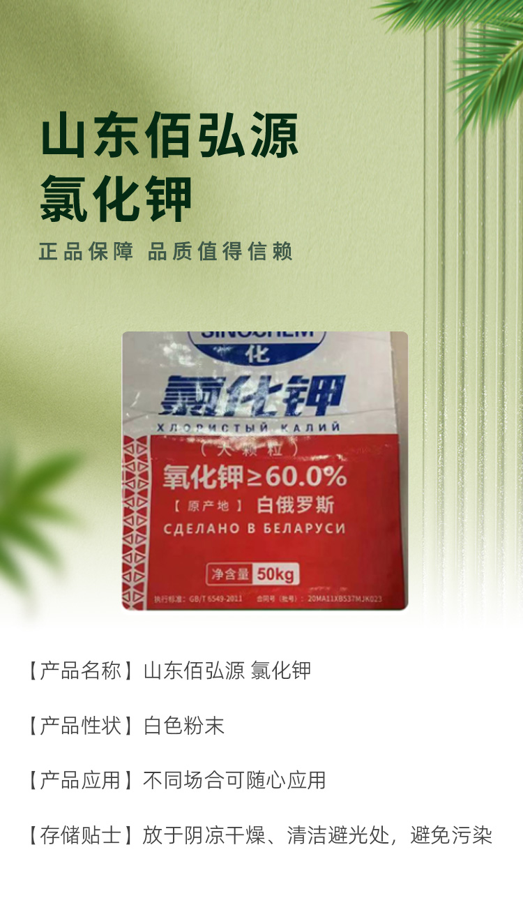 商品名称:山东佰弘源 氯化钾 商品货号 : FDD004599 品牌 : 中化 产地 : -- 产品型号 : - 包装规格 : - 等级 : - 生产许可证号 : - 含量 : - 产品形态 : - 主要用途 : -