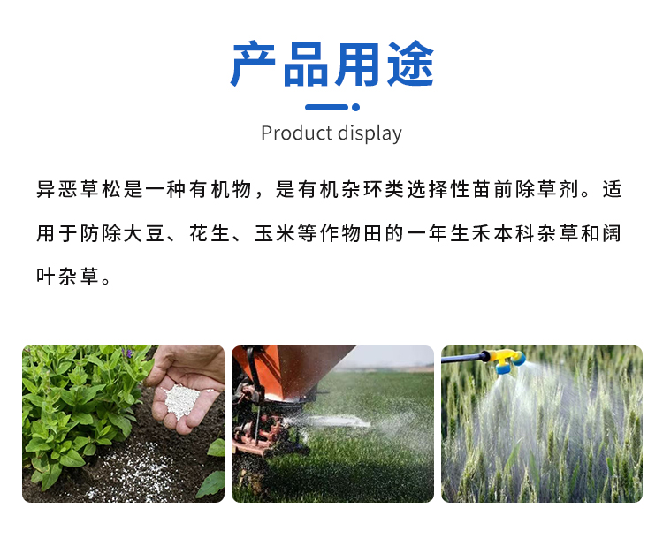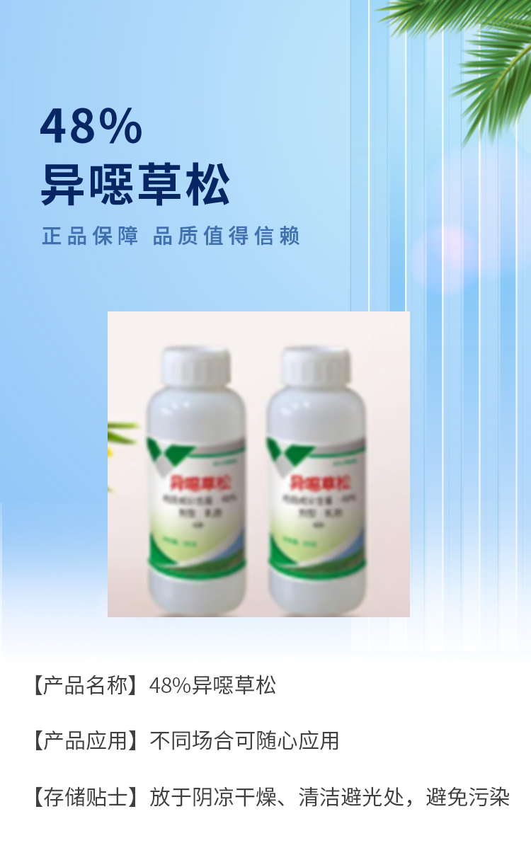 商品名称:48%异噁草松 商品货号 : FDD005024 品牌 : 其它 产地 : -- 产品型号 : - 包装规格 : - 等级 : - 生产许可证号 : - 用途 : 除草剂 用量 : - 产品形态 : - 剂型 : - 有效含量 : 48% 农药登记证号 : -