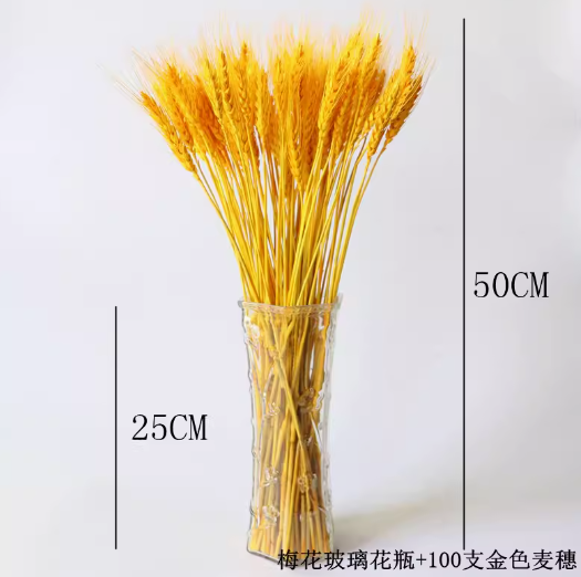 梅花玻璃花瓶1个+100支金色麦穗干花